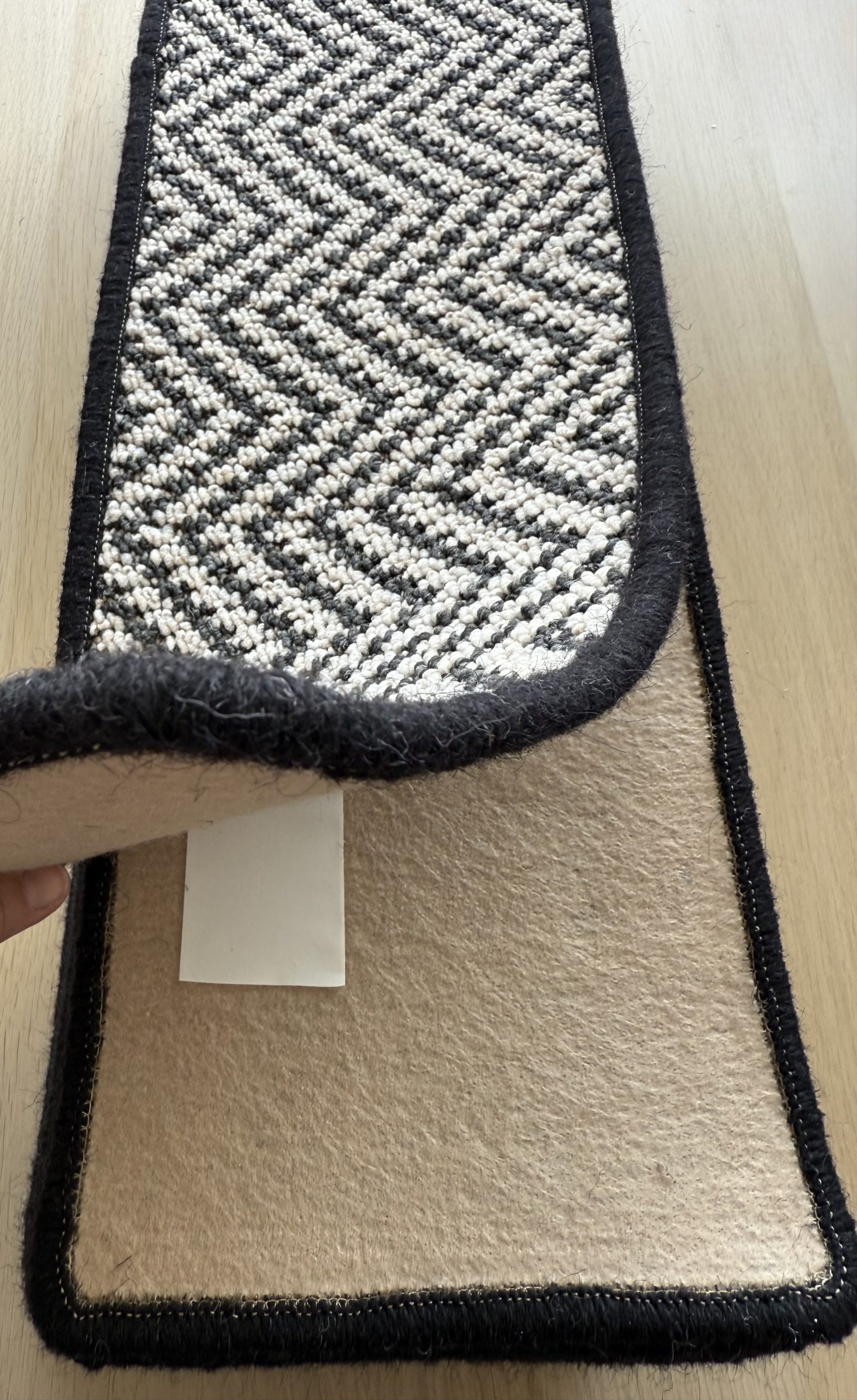 LKL’s fully bound stair pads epitomise the fusion of luxury and functionality. Crafted entirely from 100% polypropylene, each pad is meticulously crafted with a distinctive monotone zig-zag pattern. A durable black wool binding is affixed to each side for added strength. These stair pads are ideal for renters, providing a stylish alternative to a fully fitted carpet. Their ease of cleaning and maintenance makes them an excellent choice for those seeking an enhanced comfort underfoot.