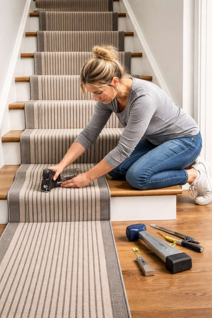 Carpet taping is a specialist finishing technique used primarily for stair runners, giving them a clean, durable, and decorative edge.